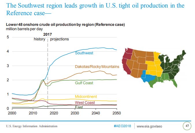 Vi visade nyligen att USA producerar rekordmycket olja och att hela ökningen kommer från tight oil. Men var i USA har produktionen skett sedan år 2000 och hur kommer det att se ut under kommande 30 år, det är vad nedanstående grafer visar. Dvs sett från idag så kommer både ökningen och och den absolut största produktionen att ske i Permian-bassängen. Observera att denna sammanställning gäller de 48 sammanhängande delstaterna. Att Hawaii inte är med spelar ingen roll i detta sammanhang, men delstaten Alaska är en stor oljeproducent.