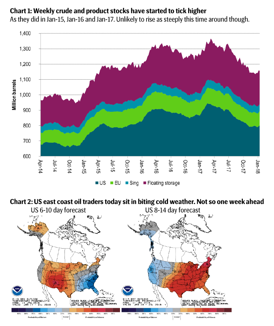 While US east coast oil traders today are shrouded in bitter cold weather they will in 10 days’ time be sitting in above normal temperatures again.
