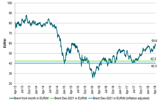 Front month Brent in euro terms only traded below this real level during the most intense sell-off from end 2015 to early 2016.
