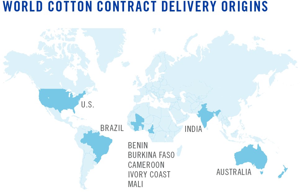 Genom att acceptera bomull från olika platser på jorden hoppas råvaruhandlarna att undvika utbudsstörningar och istället skapa en bättre genomlysning av bomullspriserna på den globala marknaden. Enligt ICE kommer bomull från Australien, Brasilien, Indien, USA, Benin, Burkina Faso, Kamerun, Elfenbenskusten och Mali att kunna användas för leverans mot det nya världskontraktet. Alla dessa länder är nettoexportörer av bomull.