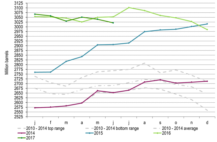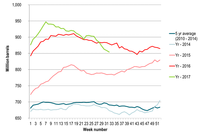 4) OECD inventories fell in Q2-17 by 9.2 mb (Mar to Jun) versus an average seasonal increase of 46.6 mb from 2010 to 2014. So strong counter seasonal draw in inventories in Q2-17