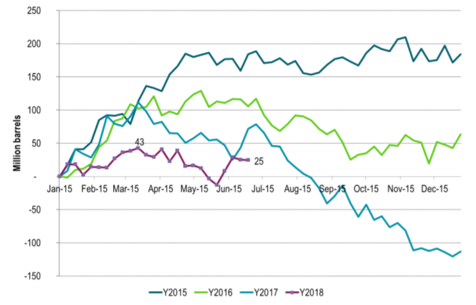 Iran has a point that it does not seem like there is a need for more oil in the market as inventories are actually up ytd by 25 m bl. This does however not take into account likely further rapid decline in Venezuela’s production in 2H18 together with seasonally higher demand in the second half of the year. Latest disruption in Libya’s production adds to the tightening outlook for 2H18. The jump in weekly stocks does however look a little random and may just be a temporary issue due to refinery maintenance.