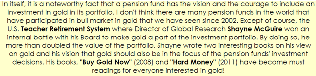 I think I don’t have to say that in my opinion, the court’s verdict is a rightful one. But this case also brings out another point of value. The Dutch central bank may not like to see a pension fund to put 13% of its holdings in gold, but it said that between 1 and 3% would be alright. Can you imagine what it would mean if and when pension funds in general would invest that percentage in gold? It would make the prediction of Shayne McGuire that gold could reach €10,000 per ounce feasible and come true easily.