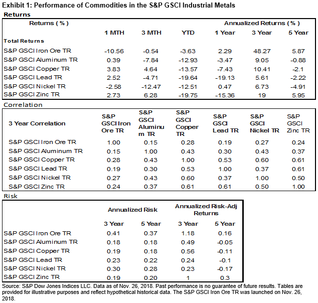 Järnmalm definieras som en industriell metall enligt S&P DJIs definition av råvarusektorerna. Terminskontrakten bakom de andra industriella metallsindexen avser bearbetade eller halvbehandlade metaller, medan järnmalmsavtalet avser råmaterial. Sett till utvecklingen under 3 år bland de industriella råvarumetallerna var järnmalm den mest framgångsrika råvaran på en riskjusterad avkastningsbas. Järnmalmen var också den näst bästa råvaran på 5 år efter zink. När det gäller korrelation uppvisade järnmetallen den lägsta korrelationen bland industriella metaller.