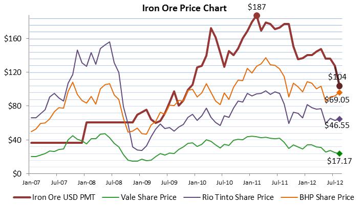 I diagrammet nedan visas hur priset på järnmalm har utvecklats från januari 2007 till mitten av augusti 2012, dvs prisfallet till under 100 dollar i fredags är inte med. Vi ser även hur aktiekurserna för Vale, Rio Tinto och BHP Billiton har utvecklats under samma period.