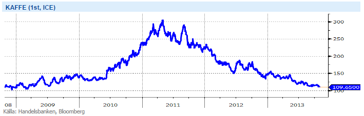 Trots ett volatilt år med mycket nederbörd i Brasilien och problem i Centralamerika med Roya (bladsvamp) så har terminspriset på kaffe fortsatt falla. Bakom den negativa trenden ligger flera år av rekordskördar. Produktionssiffror på de första 11 månaderna av kaffeåret 2012/13 visar på att produktionsbortfallet efter bladsvamp i Mexico och Centralamerica beräknas komma att bli 14,7 procent lägre än tidigare år och landar på 17.3 miljoner bags (1 bag=60 kg). Dock har förlusten kompenserats med mer motståndskraftiga kaffesorter och den totala produktionen för okt 12-aug 13 uppskattas bli 145,2 miljoner bags, 9,6 procent högre än föregående år. Av dessa 145,2 miljoner består 60 procent av Arabica (+8,5%) och resterande Robusta (+11,4%). Tittar man närmare på produktionen i Brasiliens, väldens största kaffeproducent under 2012/13, uppskattas den komma att stiga med 16,9 procent från föregående år. Lite mer osäkert är det i Vietnam, väldens näststörsta kaffeproducent, där det regnat en del senaste tiden och skörden ser ut att dröja ytterligare några veckor. Dock väntas inga större förändringar jämfört med tidigare år. Sammanfattningsvis kan man summera 2012/13 som ett bra kaffe-år. Dessvärre spås den totala produktionen på kaffe för säsongen 2013/-14 att komma minska, samtidigt som världskonsumtionen för kalenderåret 2012 väntas ligga kvar på 142 miljoner bags, vilket motsvarar en genomsnittlig årlig tillväxt på 2,4 procent för de senaste fyra åren.