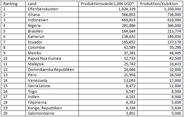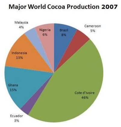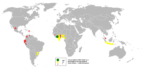 Världens fem främsta kakaoproducerande nationer är Elfenbenskusten, Ghana, Indonesien, Nigeria och Kamerun, som tillsammans står för 70 % av den globala kakaoproduktionen.