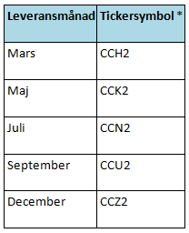 *2 avser årtalet, vilket betyder att tickern CCH2 avser leverans av kakao i mars 2012.
