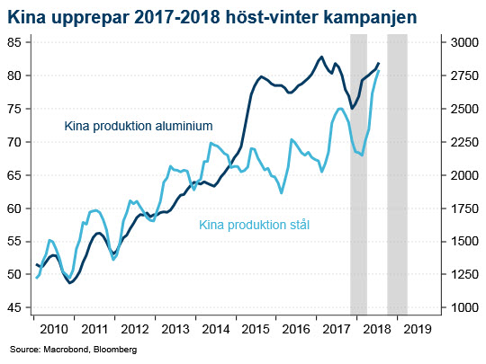 Landets kampanj för renare luft har nu utökats till att tung industri stängs ned under sex av årets tolv månader och framställningen av varje råvara ska minskas till 50 procent. Det innebär ett betydande produktionsbortfall av dessa råvaror även för den globala marknaden. Stålpriserna har redan stigit med 11 procent inför kampanjen. Årets prisrörelser kanske blir något mindre än för ett år sedan då kampanjen var mer av en överraskning. Vi tror ändå att priserna på främst aluminium och nickel har potential att stiga då sannolikheten för att det här mönstret är ”det nya normala” för Kina. De galopperande miljöproblemen kan komma att prisas in som en långsiktigt lägre produktion av dessa råvaror på kinesisk mark.