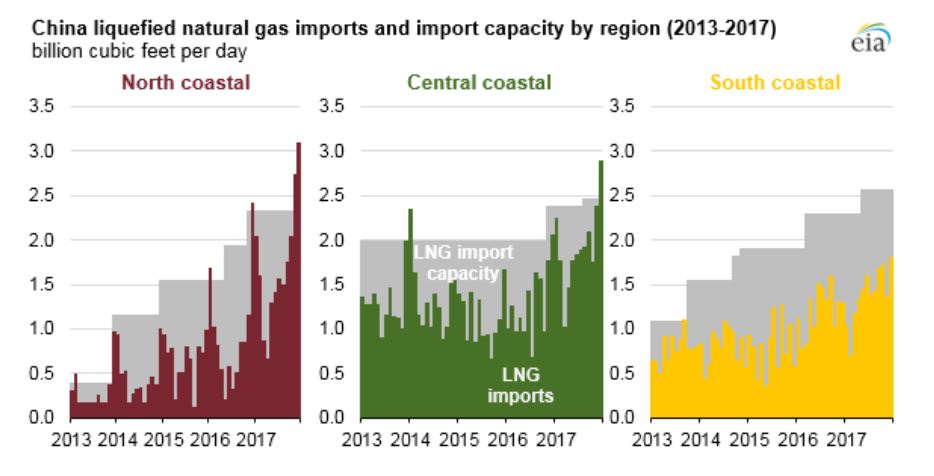 Kinas LNG-importkapacitet förväntas nå 11,2 Bcf/d före 2021, när kapacitetsutökningar vid befintliga terminaler och nya terminaler som för närvarande är under uppbyggnad är färdiga. EIA förväntar sig också att Kinas import av naturgas genom rörledningar kommer att öka, särskilt när rörledningen Power of Siberia från Ryssland tas i bruk i slutet av 2019.