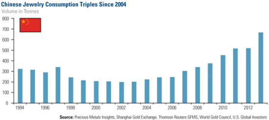 Diagrammet nedan visar hur konsumtionen av guldsmycken har tredubblats sedan 2004 vilket gör att Kina nu gått om Indien som världens största konsument och tillverkare av smycken under 2013 Enligt en nyligen publicerad artikel från nyhetsbyrån Reuters, har försäljningen av guldsmycken i Indien mattats av med 10 procent sedan importrestriktioner infördes i landet förra året. Därmed är det troligt att anta att Kina och landets befolkning är den största köparen av guld i dag.