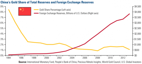 Enligt WGC har merparten av ökningen av de kinesiska valutareserverna, det vill säga landets bytesbalansöverskott, varit denominerat i USD. Tidigare använde Kina dessa dollar för att köpa amerikanska statsobligationer, men i och med den globala finanskrisen och införandet av så kallade kvantitativa lättnader (QE) har Kina dragit sig bort från den amerikanska kapitalmarknaden och har minskat sin exponering mot dollarn. Kina är emellertid i gott sällskap, det är många länder som valt att minska sin exponering mot just dollarn.
