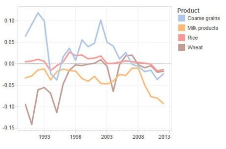 Enligt OECD (se ovan) behöver Kina redan nu importera stora mängder spannmål och mejeriprodukter. OECD räknar emellertid med att Kina kommer att förbättra sin livsmedelsförsörjning och förbli självförsörjande vad gäller de viktigaste livsmedelsgrödorna, men att detta kommer att ske något snabbare än landets produktionstillväxt på 0,3 procent per år, liknande det vi såg det förra årtiondet.