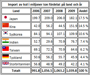 Transport av kol utgör den största kostnaden för kostnaden för kol. Majoriteten av länderna uppfyller sin inhemska efterfrågan genom import av kol. Följande lista visar de största importländerna av kol i världen och deras importuppgifterna för år 2009.