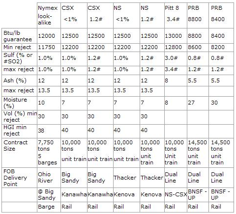 Ett terminskontrakt på kol på New York Mercantile Exchange avser 1,550 ton kol av typen Central Appalachian (CAPP).