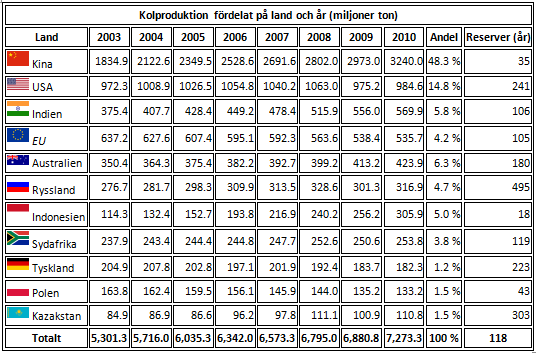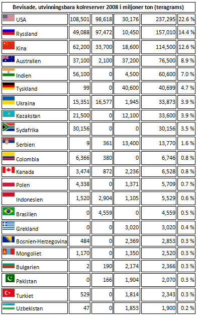Det finns uppskattningsvis 909 miljarder ton bevisade kolreserver i omkring 70 länder världen över. De största kolfyndigheterna finns i USA, följt av Ryssland och Kina. Kina är emellertid en betydligt större producent av denna råvara.
