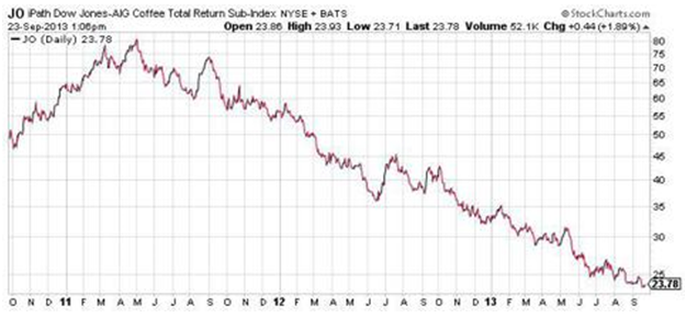 Hur lågt kan kaffet då falla? Tittar vi på JO, en ETN (börshandlat certifikat) vars värde bestäms av värdet på terminskontrakten på frontmånaden i kaffe, så ser vi att denna har tappat cirka 40 procent i värde under det senaste året.