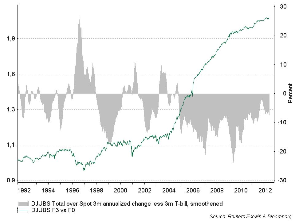 Vad driver då överavkastningen för denna strategi? Terminsstrukturen är en huvudmisstänkt. Är det contango (negativ rullyield, det vill säga avkastningsindex går sämre än spotindex) brukar den vara brantast i korta ändan av terminskurvan då överskottssituationen som är förknippad med contango brukar försvinna med tiden. I diagrammet finns strategin i logaritmisk skala tillsammans med ett mått på den historiska terminsstrukturen, mätt genom att ta skillnaden mellan ett totalavkastningindex och ett spotindex minus korträntan. Vi noterar att avkastningen för strategin varit bäst efter 2004. Detta sammanfaller dels med en utdragen period av contango och dels med inflöden till passiva råvaruinvesteringar. Contangon kan bero på andra orsaker än råvaruinvesterarnas tryck på terminskurvan även om dessa bidrar. Oavsett orsak borde emellertid contangon i sig vara en huvudförklaring till överavkastningen i kurvstrategin. Skulle backwardation återkomma sett över hela råvaruindexet, borde investerare i kurvstrategin bli orolig på riktigt.
