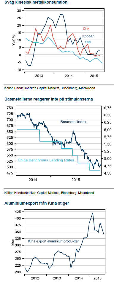 Sensommarens Kinafrossa har sänkt utsikten, inte bara för en återhämtning utan nu också för en kontinuerlig tillväxt i Kinas metallkonsumtion. Stålkonsumtionen har legat i negativa tillväxttal sedan mitten av 2014 och har fallit till minus 7 % under sommaren i år. Givet stålkonsumtionens värde som proxy för ekonomin är det svårt att förena stålrecessionen med BNP tillväxtmålet på 7 %.