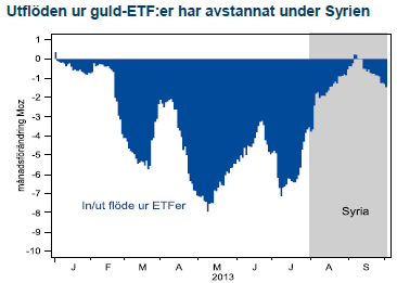 Vår syn på guld som en metall vars långa trend går nedåt ligger fast. Efter att de kortsiktiga positiva effekterna från en Amerikansk attack på Syrien och Feds uteblivna nedskalning av QE så tror vi åter att guldet kommer vända nedåt. En starkare amerikansk ekonomi, högre USA-räntor, låg inflation samt att Fed ska skala ner QE är alla argument för lägre guldpriser. Fed överraskade när man inte började skala ner obligations-köparprogrammen den 19:e sep. Främsta skälet är oro för finanspolitiken samt åtstramning i de finansiella förhållandena. Nedskalning kan nu bli aktuellt senare i år, men nu är det svårt att veta vad som ska prisas då Fed börjat sväva på målet. Minskat stöd till marknaden ska, allt annat lika sänka inflationsförväntningarna och stärka USD, båda faktorerna är negativa för guldpriset.