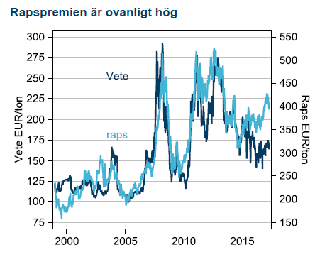 Högre oljepris och vissa väderproblem i Europa och Ukraina fick rapspriset att stiga oväntat under förra odlingsåret. Vi ser starka skäl för den ovanligt höga premien över vete att suddas ut under året. Främsta skälet är att vi tror på lägre oljepris, andra skälet att USA sannolikt kommer leverera en rekordskörd av soja och tredje skälet att en normal skörd i Europa kommer sänka rapspriset. Raps är därmed den gröda där vi ser störst anledning att sälja terminer och tror att november 17 slutar på omkring 320 EUR/ton 15 % under dagens nivå.