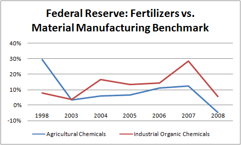 Observera att under 2008 föll produktionen av jordbrukskemikalier som Monsantos Round-Up på grund av att det internationella patentet som Monsanto hade på Round-Up (fosfatpesticid) löpte ut, vilket sporrade billig internationell produktion och minskar incitamentet att producera produkten på företagens hemmamarknad, i detta fall USA.