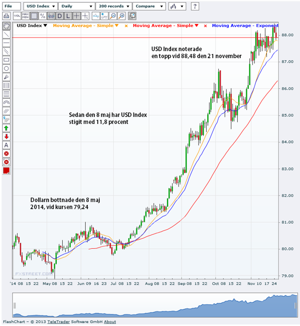 Den amerikanska dollarn har befunnit sig i en uppåtgående trend sedan den 8 maj 2014. Under en period av sex månader har dollarn stärkts med 11,6 procent, en imponerande uppgång för en valuta. I november noterade US Dollar Index en ny topp om 88,48 för att sedan stänga veckan på 88,405. Dollarn är på väg att utmana några viktiga långsiktiga motståndsnivåer, till exempel toppen från mars 2009 på 89,71. Den allra viktigaste nivån ligger emellertid högre, på 92,53 från november 2005. De tekniska analytikerna säger att om US Dollar Index bryter denna nivå så är himlen nästa motståndsnivå.