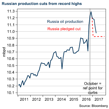 We see a close to 100% probability of an extension of oil production cuts from OPEC at the upcoming OPEC meeting in Vienna on May 25. For H2 2017, we see compliance with proposed cuts as a much more difficult issue than the deal itself. We think there is a 95% probability that Russia will sign on for a new six-month production cut period, but we see only a 30% probability that Russia will keep compliance for that period. Oil cuts during H2 2017 will come at a high cost due to seasonally higher production. We believe the next big price turn will come from non-compliance from Russia in particular but also other OPEC countries, as growing US production shows evidence of the futility of subsidising growth there by keeping production off stream. Saudi Arabia seems assured that production cuts at any price are the right way to go; it seems to us that the longer OPEC tries to keep production down, the more such measures backfire.