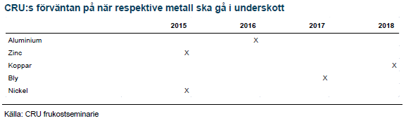 - Konsensus förväntan på när underskott ska uppstå per metall: