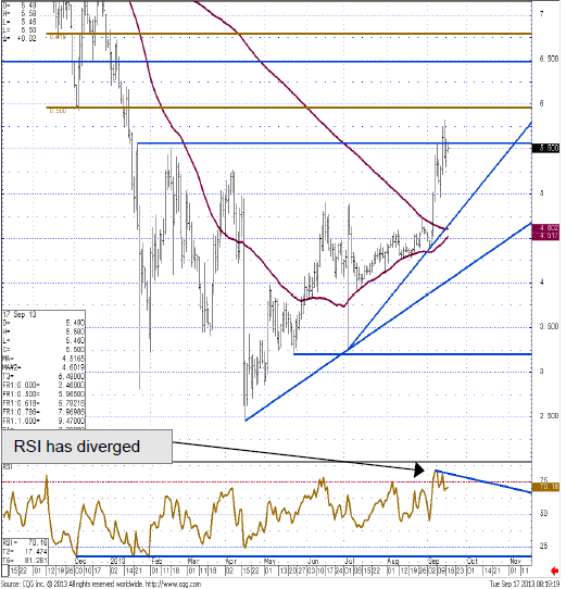 - December 2013 ICE ECX Carbon Emissions have pushed higher to 5.83 but appear to be struggling to maintain a foothold above the 5.57 January high. We note the divergence of the daily RSI, which depicts a loss of upside momentum, we also have a 13 count on the TD combo – which depicts increasing likelihood of failure. Currently we would allow for a retracement to the 55 and 200 day moving averages circa 4.60/52, but currently we look for 4.38, the 3rd September low to hold.