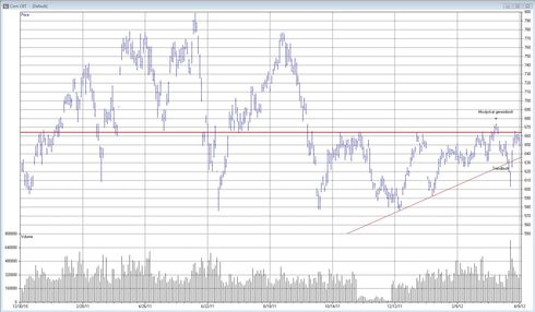 Idag kan vi se tillbaka på den senaste månadens rörelser och kan då konstatera att majs mycket riktigt attackerade motståndet vid 665 USD redan den 16 mars. Vi fick en stängning på 673 USD denna dag. Så långt var allt bra. Men redan dagen efter föll majspriset under motståndet igen. Uppgångssignalen var med andra ord falsk och sådant brukar straffas hårt. Så skedde även denna gång.