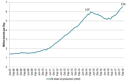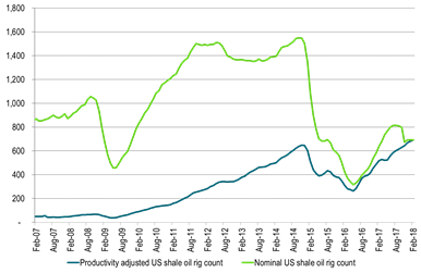 The EIA estimates that US shale oil production will grow by 110 k bl/d from Jan to Feb which is a marginal rate of 1.3 mb/d. This is in stark contrast to EIA’s latest monthly oil report which predicted crude oil production from US lower 48 states (ex Gulf of Mexico) would only grow at a rate of 33 k bl/d in 1Q18 and on average only 42 k bl/d through 2018.