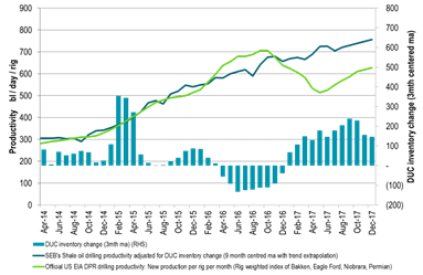 US shale oil volume productivity growth (new oil per rig in operation) is in our calculations up 23% y/y 4Q17 to 4Q16. This is in strong contrast to EIA’s official productivity measure of zero growth which is not taking account of the huge build-up of DUCs.