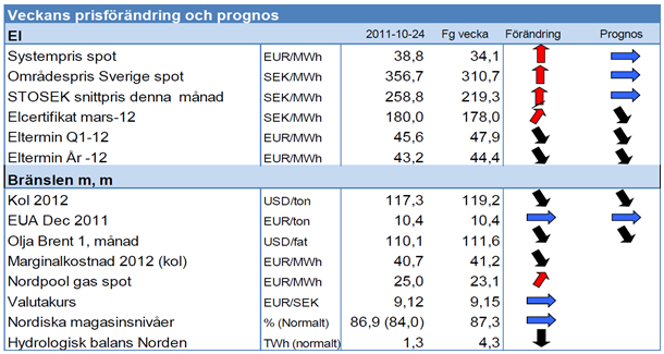 Efter en kortvarig prisuppgång i början av förra veckan har terminspriserna återigen sjunkit. Riskpremien för kärnkraftsbortfall har minskat, brytpriset på kol sjönk och väderprognoserna har blivit något ostadigare. Vi tror dock att det finns utrymme för ytterligare ett par euros nedgång, framförallt om resultatet från toppmötet nu på onsdag blir klent. Detta gäller även för bränslemarknaden där en realistisk överenskommelse på onsdag kan leda till att oljepriset stiger mot €114-nivån medan en besvikelse kan resultera i bottennivåer närmare €103.