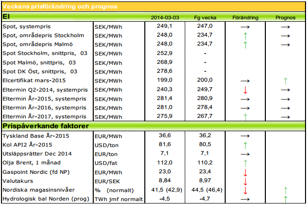 Minskad last i samband med milt och varmt väder (för årstiden i alla fall) har tryckt ner systempriset. Förbättring i energibalansen och en vinter som går mot sitt slut håller terminsmarknaden nere på rekordlåga nivåer. Kolet har under en längre tid varit i en nedåtgående trend men utvecklingen i Ukraina påverkar bränslepriserna så tills situationen där är under kontroll kan vi nog få se en del rörelser uppåt. Under veckan har vi även haft kraftiga svängningar på utsläppsrättsmarknaden.