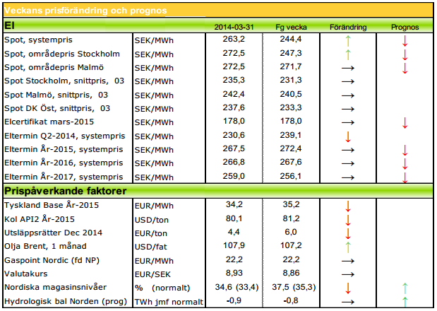 Ett trendbrott på elterminerna – nu går det ner igen! Vädret spår stigande temperaturer och efter några få inledande torra dagar, nederbörd väl över normalvärden samt blåsigt. Elcertifikaten går fortfarande ned och elspoten var högre förra veckan än veckan innan. CO2 har rasat liksom elcerten. Olja och kol inga stora förändringar. Hydrobalansen förbättrades till strax över noll.