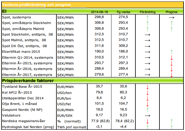 En dryg månads uppgång i elterminerna har vänt ned på blöta prognoser. Vinden stark i början av denna vecka. Nätarbeten samt revision i några kärnkraftverk ger antagligen högre områdespriser i SE mot slutet av veckan.