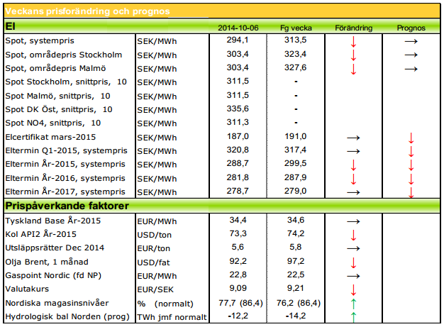 En nedgång över hela linjen på blötare väderlek. Detta verkar hålla i sig en tid till. Hydrobalansen nästan 2 TWh bättre än väntad. Priset på CO2 håller sig stilla till ned samt kol och olja fortsätter att sjunka. Hydrobalansen fick en återhämtning men saknas ännu rätt mycket snö i fjällen. Markvattnet har fyllts på.