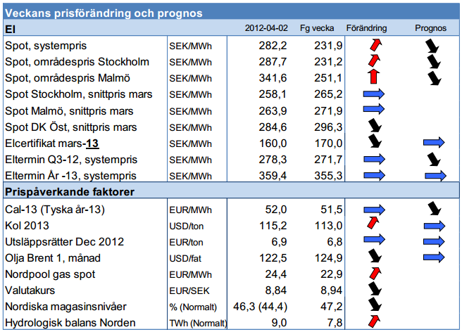 En ökad tillrinning samt blåsigt väder i söder har pressat spotpriserna. Mycket vind i Tyskland gör dessutom att överföringen från Norden stoppas vilket har bidragit till lägre priser i elområde Malmö än system (Finland har också höjt systempriset). Vi räknar nu med några dagars högre spotpriser till följd av lägre temperaturer men påskhelgen drar ned efterfrågan. Terminskontraktet för Q3 ligger över dagens spotpris. Vi har välfyllda vattenmagasin vilket gör att vi bör se låga priser även under senvår och sommar och kontraktet bör därför kunna röra sig nedåt. Hur mycket beror dock på hur kraftig vårfloden blir där temperatur och nederbörd de närmaste veckorna har avgörande betydelse. Risken för prisskillnader är forfarande störst under vårflodsperioden då systempriset tillfälligtvis kan pressas. De milda temperaturer vi redan haft tillsammans med fortsatta överföringsbegränsningar mot Finland minskar dock risken. Årskontrakten har legat stabilt liksom de tyska terminskontrakten och CO2. Idag släpptes preliminär statistik på verifierade utsläpp för 2011 vilket drog ned priset på utsläppsrätter.