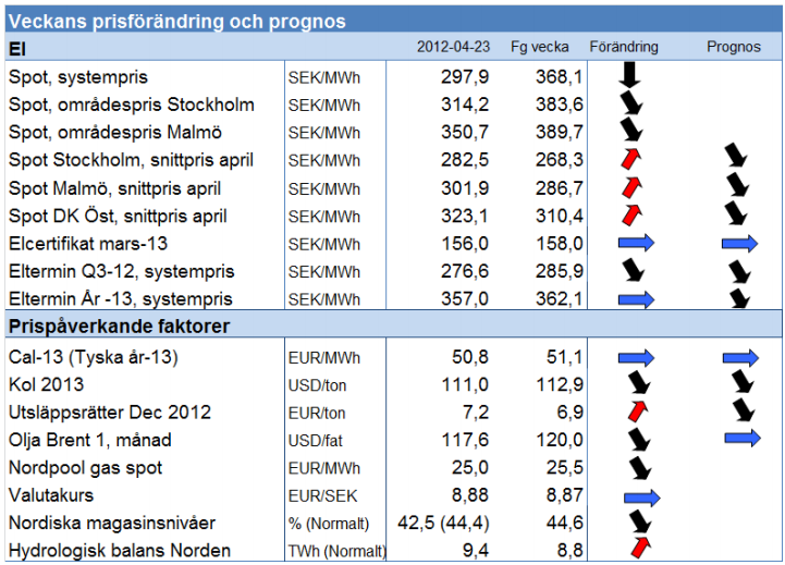 De närmaste dagarna räknar vi med spotpriser strax under SEK 300/MWh och sedan fallande då vi har mer nederbörd att vänta i ett redan starkt hydrologiskt läge. Det kommer dessutom in mer vindkraft framåt mitten på veckan. Denna och nästa vecka bör den första vårfloden komma igång men på grund av tidigare milda temperaturer har mycket snö på lägre nivåer smält och prispressen väntas blir relativt kortvarig och inte så stark. Marknaden tror för närvarande på priser runt €27/MWh under vecka 18. Priserna på de korta terminskontrakten påverkas nu i hög grad av nederbördsprognoser och det är fokus på kommande vårfloder. Som det ser ut nu är risken för mycket spill relativt låg vilket ökar chansen till låga priser även under slutet av sommaren och hösten. Bränslekomplexet är fortfarande svagt och fundamentalt ser vi inga stora prispåverkande händelser den närmaste veckan, om det inte mot förmodan skulle komma politiskt besked gällande utsläppsrätter, vilket gör att vi tror på en sidledes riktning till svagt ned på årsterminerna.