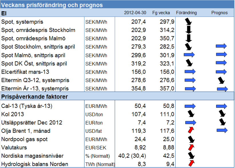 Låga spotpriser några dagar framöver är att vänta innan det blir kallare och priserna återgår till de senaste dagarnas nivåer runt SEK 270-280/MWh. Den kommande kylan gör att snösmältningen avstannar och minskar press på vattenkraftsproducenter och på spotpriserna fram till dess att snön på högre höjder smälter i sommar. Det kan bli fortsatta prisskillnader mellan elområdena på ca SEK 20-50/MWh, bland annat beroende på begränsad överföring av kraft från elområde 3 till södra Sverige. Vi har fortfarande mycket vatten i magasinen och den periodvisa snösmältningen har gjort att det ser bra ut för sensommaren och hösten och vi håller fast vid vår tro på ytterligare nedsida för kvartal 3. Terminskontraktet för nästa år har fallit något tillsammans med den tyska marknaden och kolpriserna. Om inte oljan stiger på grund av utvidgad bojkott mor Iran så ser vi en svag fundamental situation och vi tror på en rörelse sidledes till svagt ned på årsterminerna.