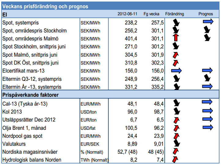 Överföringsbegränsningar mellan Norge och Sverige ledde till periodvis höga prisskillnader förra veckan. I början av denna vecka blir vindkraftsproduktionen i södra Sverige och Danmark liten vilket ger stora prisområdesskillnader. Dessa förväntas dock minska i slutet av veckan. De kommande dagarna blir det åter något blötare än normalt. Terminspriserna föll förra veckan på blötare prognoser och på fallande bränslepriser och tyska elpriser. Vattenproducenterna har nu full kontroll på produktionen och lär kunna hålla spotpriset på nuvarande eller något lägre nivåer, vilket borde begränsa nedsidan på terminsprodukterna. Högre bränslepriser och högre priser på utsläppsrätter kan ge ett ökat köpintresse för årsprodukterna.
