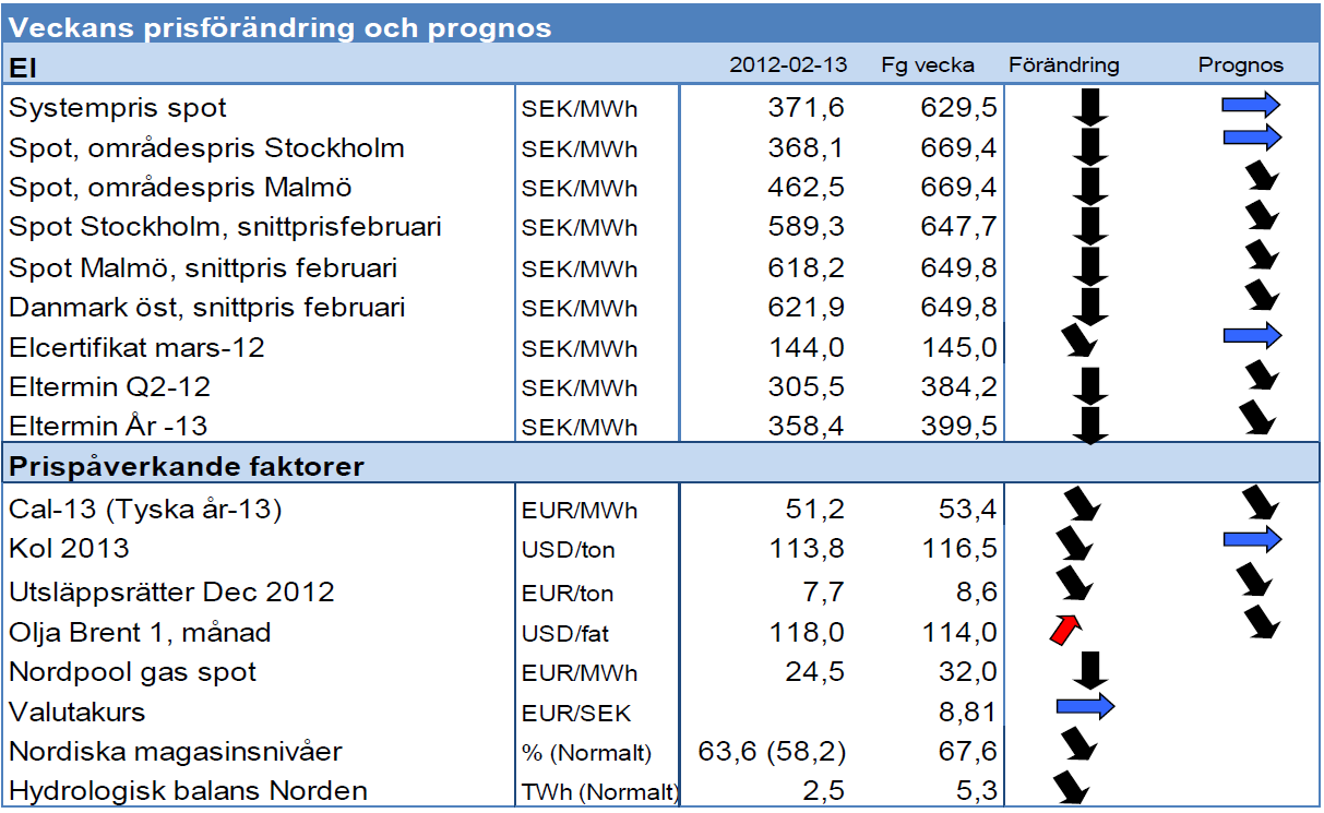 Den senaste månadsprognosen tyder på åter ostadigare väder och temperaturer runt normalt. Även i Tyskland stiger temperaturerna och det väntas mer vind från mitten av veckan. Detta, tillsammans med att vi har fått tillbaka en del kärnkraft, gör att vi inte ser någon uppsida på terminsmarknaden den närmaste veckan. Skillnaden i pris mellan elområdena har varit relativt hög under februari med en enstaka dag på över SEK 200/MWh, detta med mycket kallt väder och låg vindkraft. I genomsnitt har skillnaden mellan systempris och elområde Malmö dock legat på SEK 55/MWh under februari vilket fortfarande är lägre än terminskontrakten (cfd). Både spotpriser och prisområdesskillnaderna bör nu minska i takt med mildare väder och mer vindproduktion. Bränslepriserna är fundamentalt svaga även om oljan tillfälligtvis har fått skjuts av Greklands acceptans av sparpaketet och situationen i Iran.