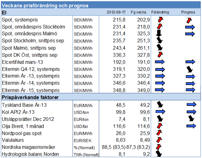 Denna vecka har vi betydligt mindre kärnkraft och det blir kallare. Detta leder till högre spotpriser samt en ökad risk för prisskillnader mot SE4. Q4-12 ligger kvar på samma nivåer, det är dock fortsatt blött och kontraktet handlas ändå över brytpriset, det gör att vi ser en fortsatt nedsida innan stängning. Vi börjar även snegla på kvartal 1 2013 som nu ligger på €41,25/MWh. Det är nästan €5 högre än Q1 2012 stängde på. I nuläget har vi en betydligt bättre vatten- och kärnkraftsituation. Vi har alltså en bra grund för lägre priser, frågan är hur kallt det blir i vinter. För de längre kontrakten kommer troligen ett politiskt möte om utsläppsrätter spela in. Oljepriset är fundamentalt för högt men på grund av ökade oroligheter i mellanöstern är det inte troligt att det går ned just nu. Elcertpriset har, som vi förutspådde förra veckan, stabiliserats tillfälligt.
