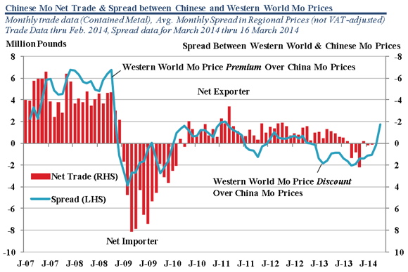 In 2013 China’s domestic molybdenum prices traded at premium (~14.3%) to western world prices so there was no incentive to export molybdenum. This trend remained in place until the run up in western world prices in the first two weeks in April. According to Metal Bulletin, Chinese prices held on average a $0.91 or 9.2% premium over western world price between 1 January and 21 March. Since the ruling, however, western world prices are at a premium to China. As of 16 April, Metal Bulletin reported western world molybdenum at $13.20 and Chinese molybdenum at roughly $10.55, a premium of $2.65 or 20%. Obviously both markets need time to process the news. However, western world prices have risen to levels that will likely encourage exports from China in the near term. Even with current duties in place on various molybdenum products, some of which are as high as 20%, arbitrage opportunities still exist for Chinese exporters. The current sizable price differential may act as an incentive for the Chinese government to keep present taxes in place to help disincentivize exports of their national molybdenum resource.
