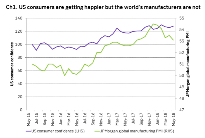 Uncertainty for Call-On-OPEC in 2H18 clearly warrants serious attention. While US consumer confidence is ticking higher the JPMorgan global PMI manufacturing index has ticked lower and lower since its peak in December last year even though it is still in positive territory of 53.1. Global growth has definitely cooled in 1H18. At the moment it does not seems as if a booming US economy is able to drag the rest of the world with it. Rather it seems like higher interest rates, a stronger USD and a higher oil price increasingly is creating a headwind for the global economy. The story in the FT today that 16 large global financial companies are down more than 20% from their peaks is highlighting the fact that the global economy is having a problem swallowing higher interest rates, stronger dollar and more expensive oil.