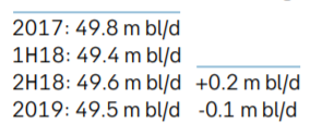 So while production from the deliberate cutters within OPEC+ will increase by 1 m bl/d from 1H18 to 2H18 and another 0.5 m bl/d from 2H18 to 2019, there will basically be no net increase in production except for a slight 0.2 m bl/d increase from 1H18 to 2H18.