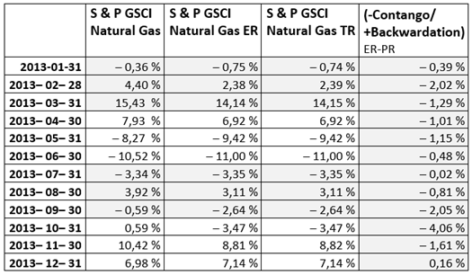 I det andra indexet, DJ-UBS, hade naturgasen en vikt på 10,4 procent under 2013, vilket hjälpt till att kompensera att detta index hade en indexvikt om 10,8 procent i guld.