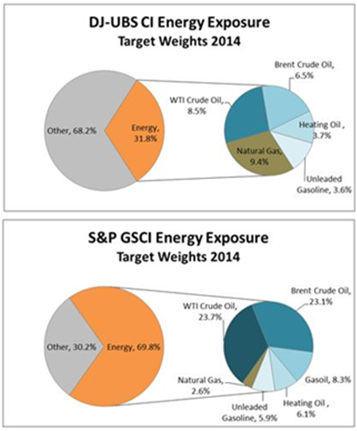 I det andra indexet, DJ-UBS, hade naturgasen en vikt på 10,4 procent under 2013, vilket hjälpt till att kompensera att detta index hade en indexvikt om 10,8 procent i guld.