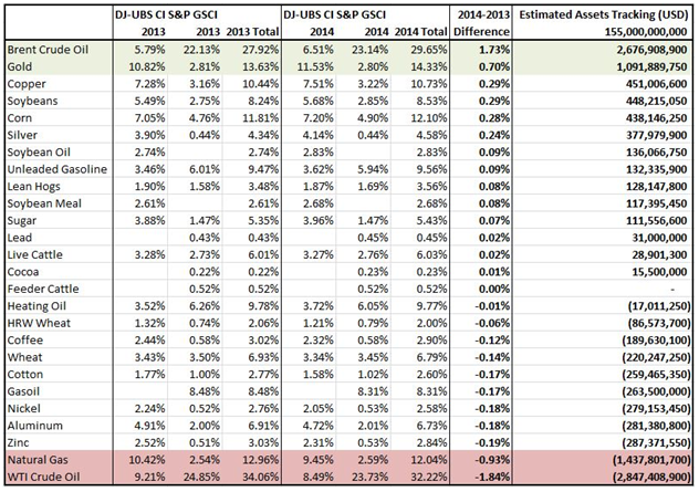 Det finns cirka 12,4 miljarder USD placerade i råvarutillgångar som kommer att re-allokeras under 2014 som en följd av ändrade viktfördelning i DJ-UBS CI och S&P GSCI.